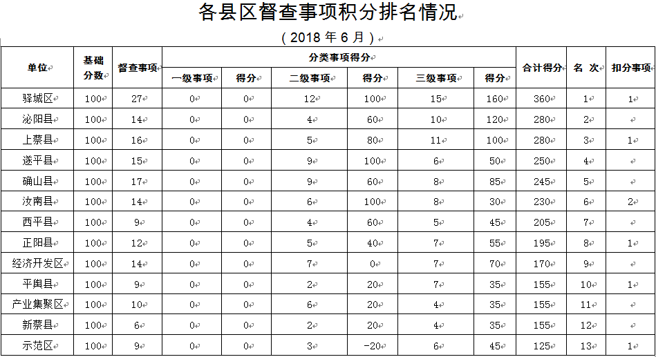 【駐馬店廣視融媒訊】為貫徹落實(shí)市政府提出的“干成事是硬道理”的工作準(zhǔn)則和“行動(dòng)迅速、善抓落實(shí)、勇?tīng)?zhēng)一流、廉政為民”的行為準(zhǔn)則,按照《駐馬店市人民政府辦公室關(guān)于進(jìn)一步加強(qiáng)督查工作推動(dòng)政府工作高效落實(shí)的通知》(駐政辦〔2018〕1號(hào))和《督查事項(xiàng)積分管理暫行辦法》(駐政督通〔2018〕20號(hào))文件要求,市政府對(duì)督查事項(xiàng)實(shí)行積分管理,堅(jiān)持一月一匯總,一月一排名,一月一公布。
