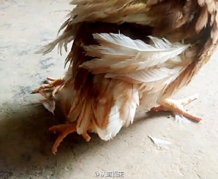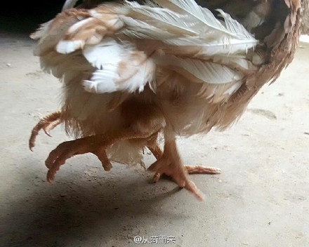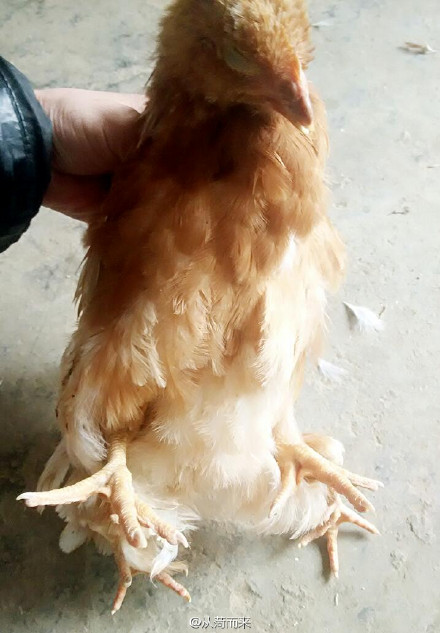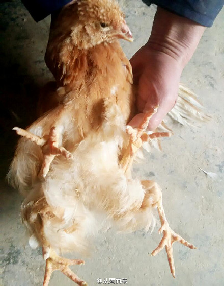 朱女士家經營著一座養雞場,由她的父親打理。今天上午,朱女士的父親從養雞場帶回了一只四條腿的雞。這只雞除了正常的兩條腿外,尾部還長了兩只向后伸直的腿。朱女士見到后感到十分驚奇,隨即拍照并發了微薄。