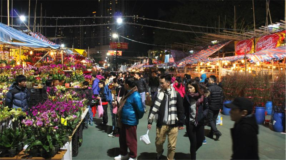 逛花市是香港人過新年的必備節目。在粵語中,“花”與“發”諧音,是恭祝來年發財和好運的意思。每年春節,香港人在吃過年夜飯后,通常都會去逛逛花市,湊湊熱鬧,希望行個大運。