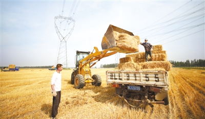 “三夏”時(shí)節(jié),河北不少地方的農(nóng)民回收麥秸,賣(mài)給奶牛場(chǎng)制作飼料。這樣不僅避免了焚燒秸稈污染空氣,還給農(nóng)戶帶來(lái)了收入。圖為6月15日,在河北省永清縣李家口村,農(nóng)民將壓成塊的麥秸裝車(chē)回收。
