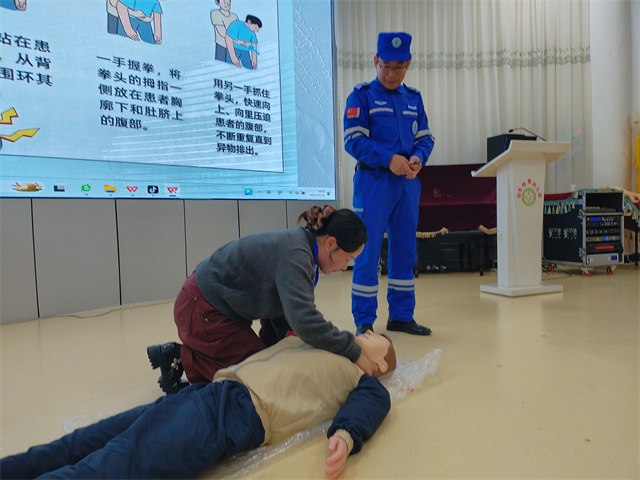 為使理論與實踐緊密結合,救援隊員們在講解后現場進行了規范的操作演示。從判斷環境安全、檢查意識到胸外按壓的正確姿勢、頻率與深度,再到人工呼吸的技巧;針對海姆立克急救法操作手法,一一進行了細致展示。
